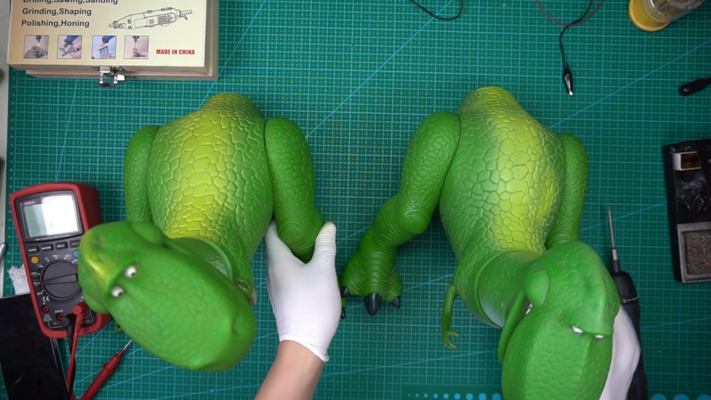 The ThinkWay Collector Edition Rex toy, manufactured in China, is a 1:1 movie-scale replica featuring voice-activated functionality. When exposed to external sounds, it moves its head and two front claws while emitting sounds. Twisting its tail can also activate it. Additionally, removing the speaker reveals two contact pins for “Try Me” mode.