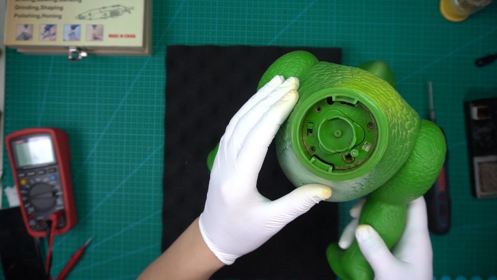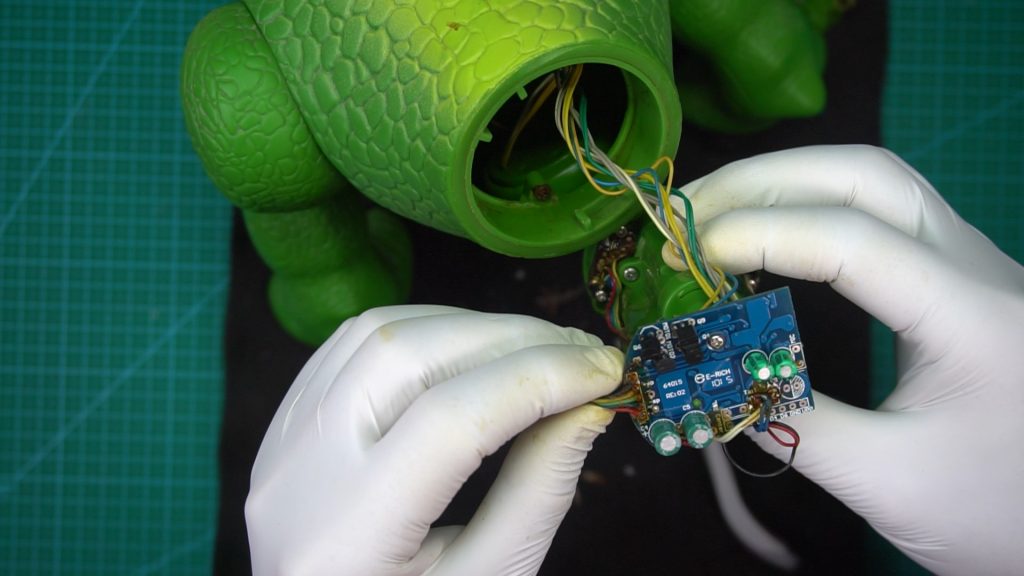 - Detach the circuit board. Inside the torso, you’ll find the speaker housing, which may require forceful prying to open.