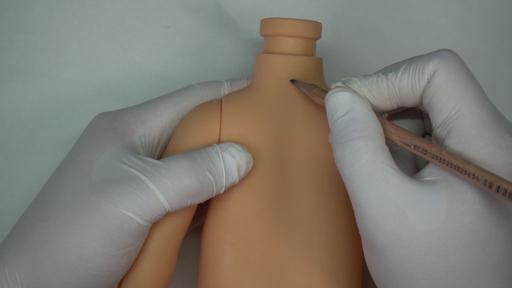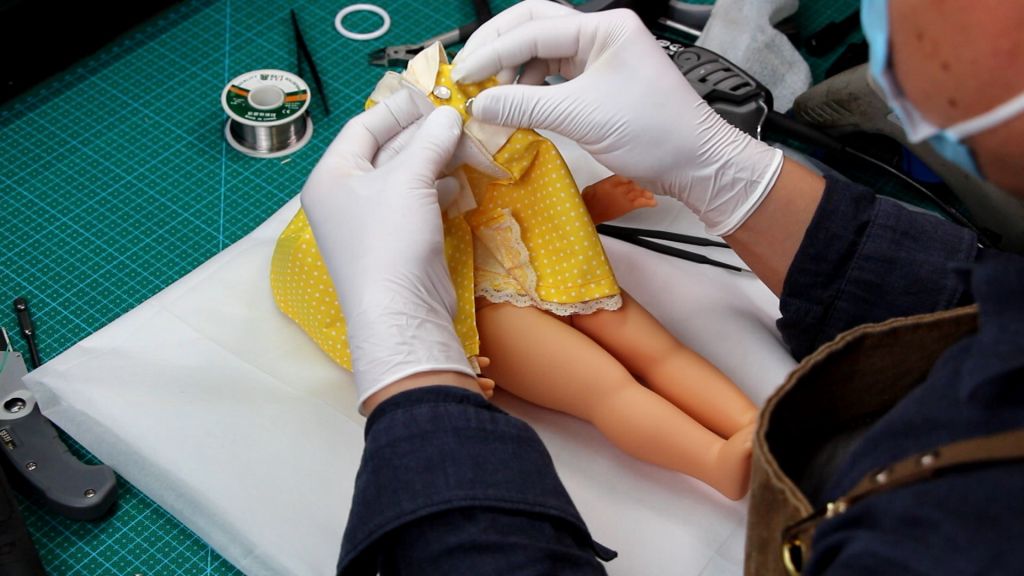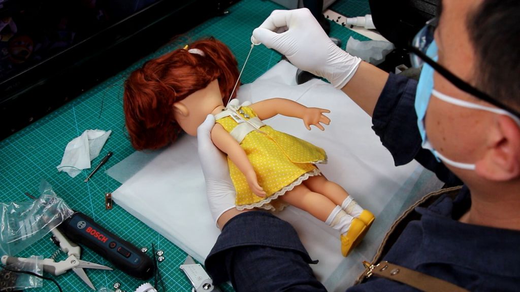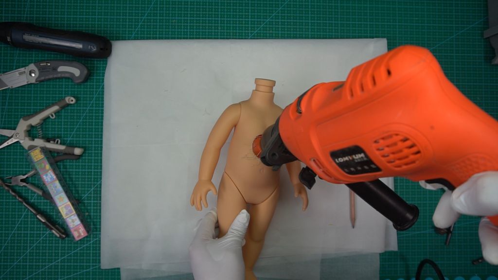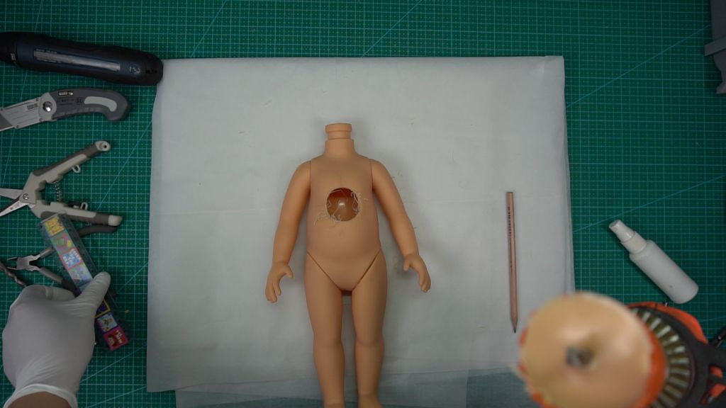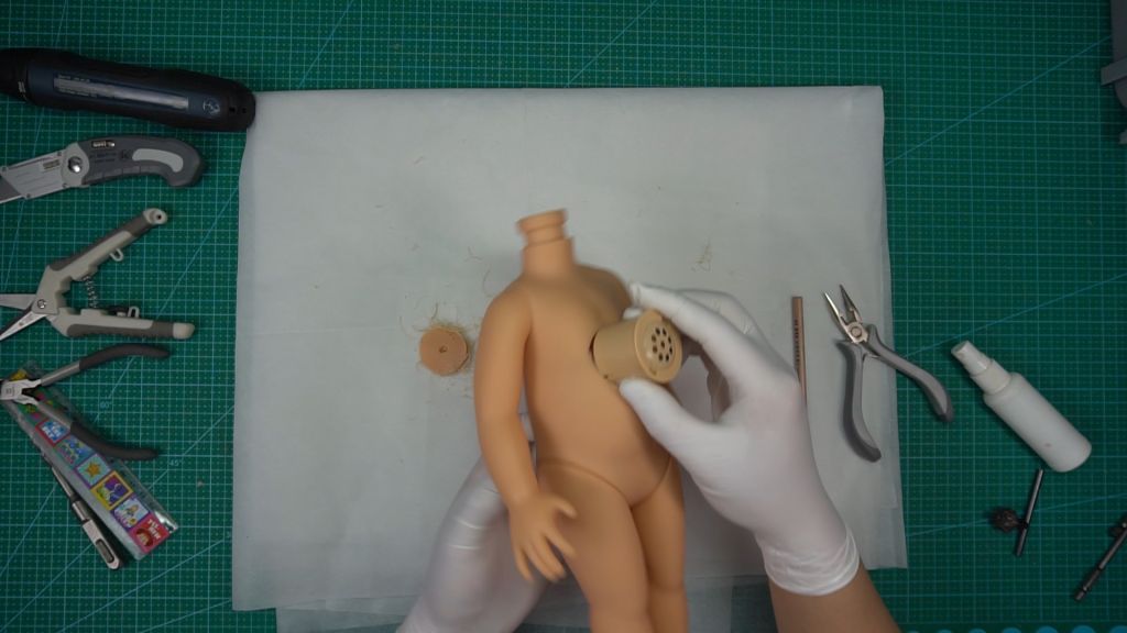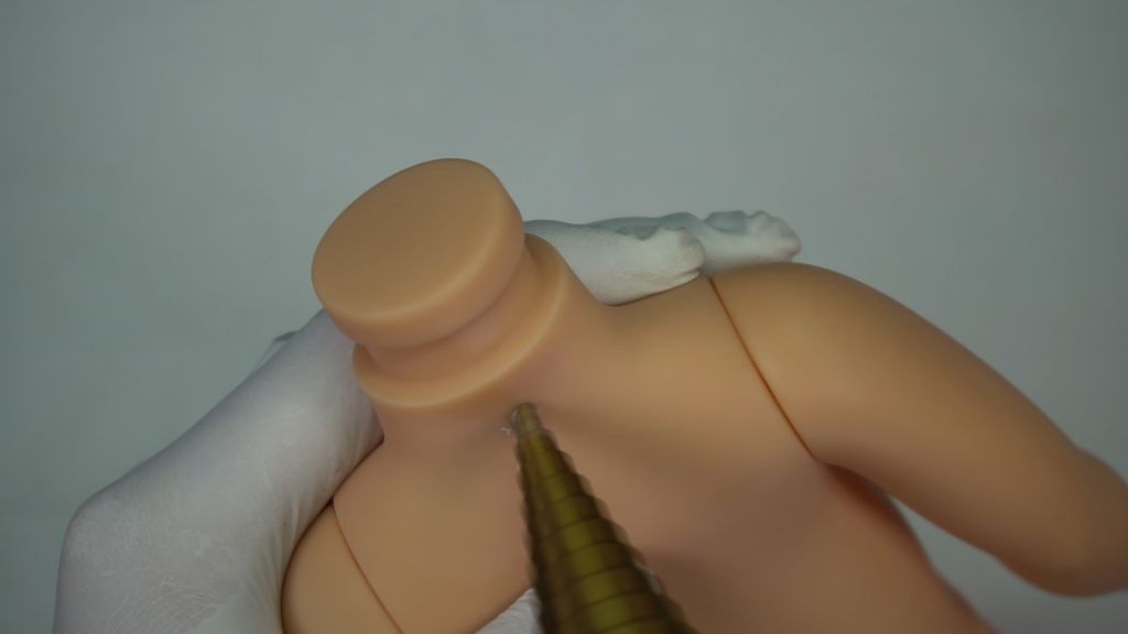 First, because Gabby Gabby’s body is completely sealed, I will open a round hole on her belly to serve as the speaker hole opening. This hole will also be relied upon to insert the internal voice box, install the pull-string mechanism, and thread the string. Additionally, a round hole for the pull string must be created on the back of her neck.